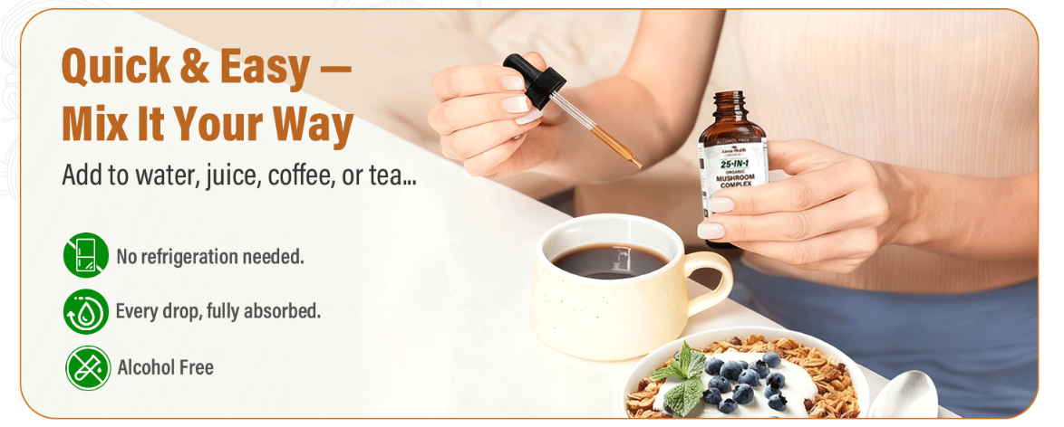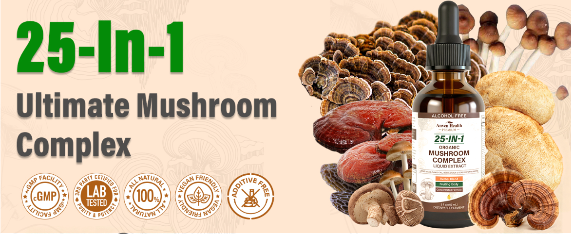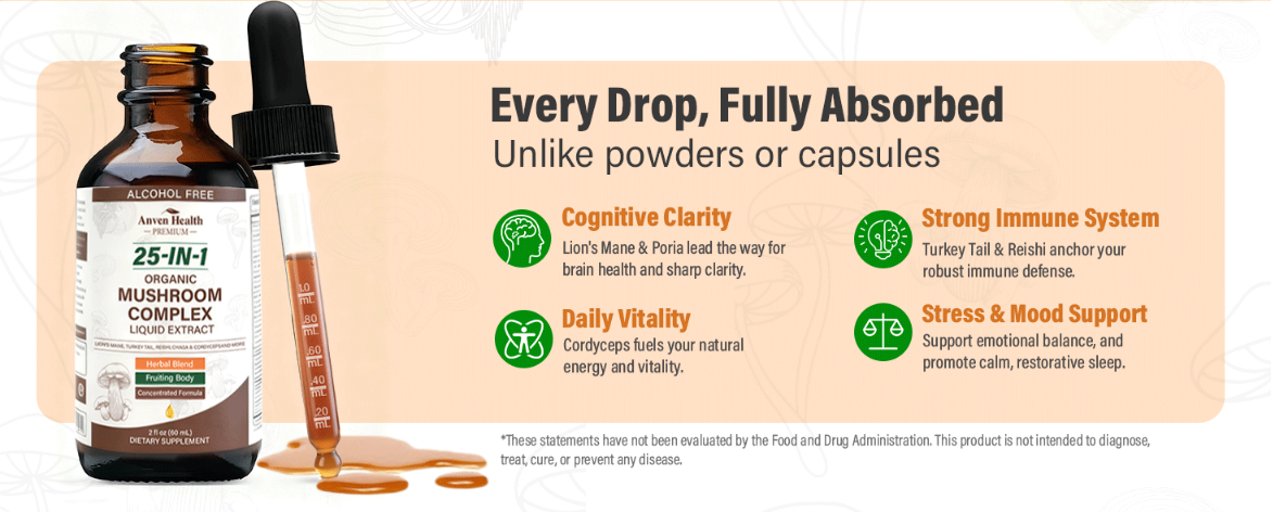 25-in-1 Organic Mushroom Complex Supplement Liquid Drops with Ashwagandha, Lion's Mane, Reishi, Chaga, Cordyceps, Turkey Tail Tincture for Immunity, Energy & Cognition